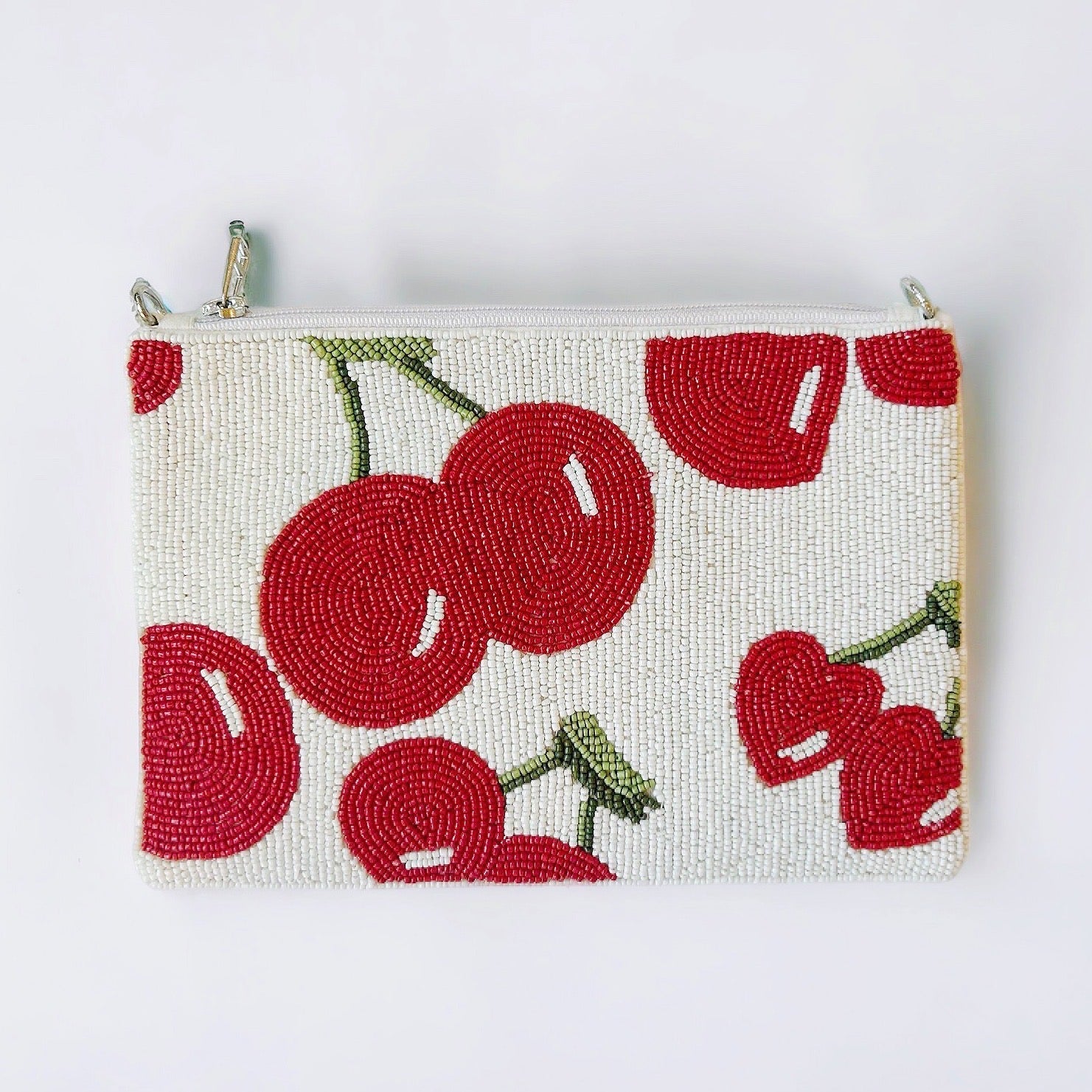 So much style packed into a small bag…our beaded cherry bag with silver hardware and chain strap. It is just what you need for your next adventure.