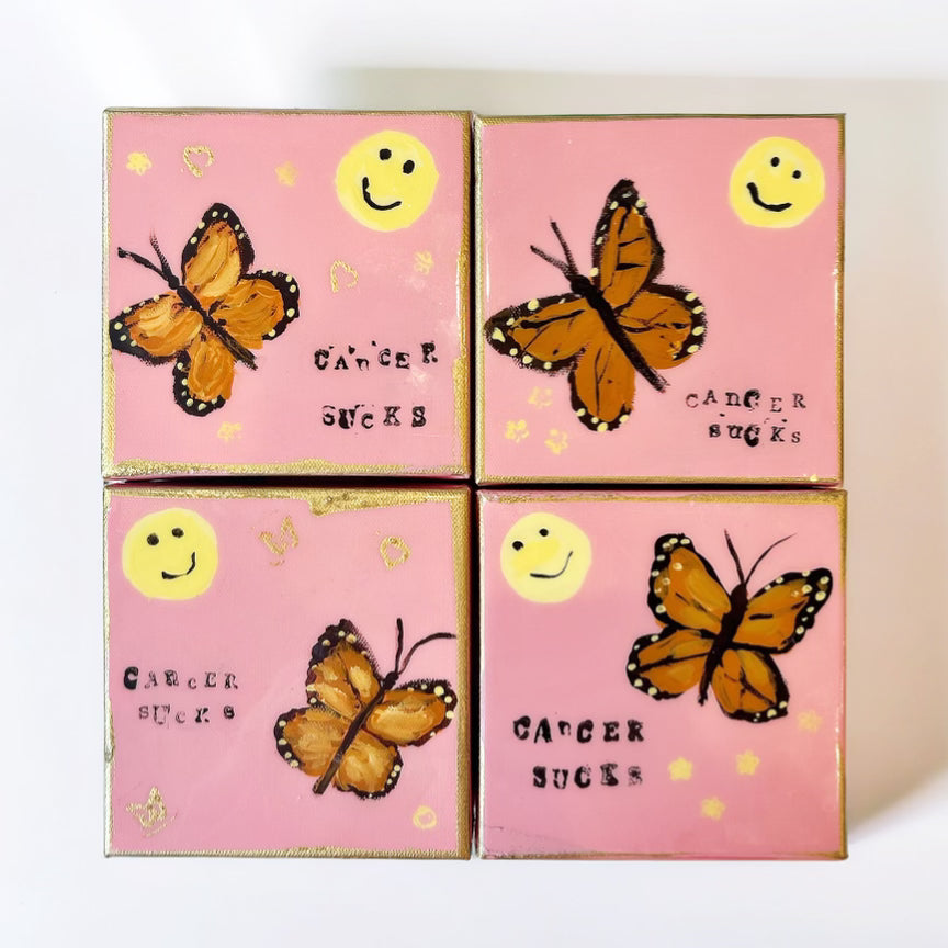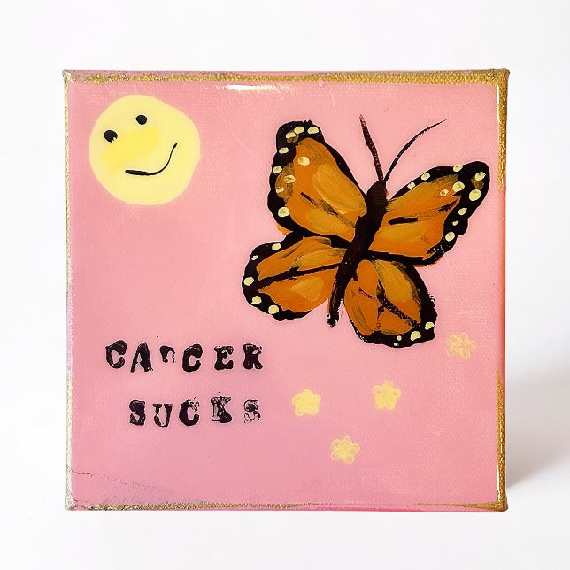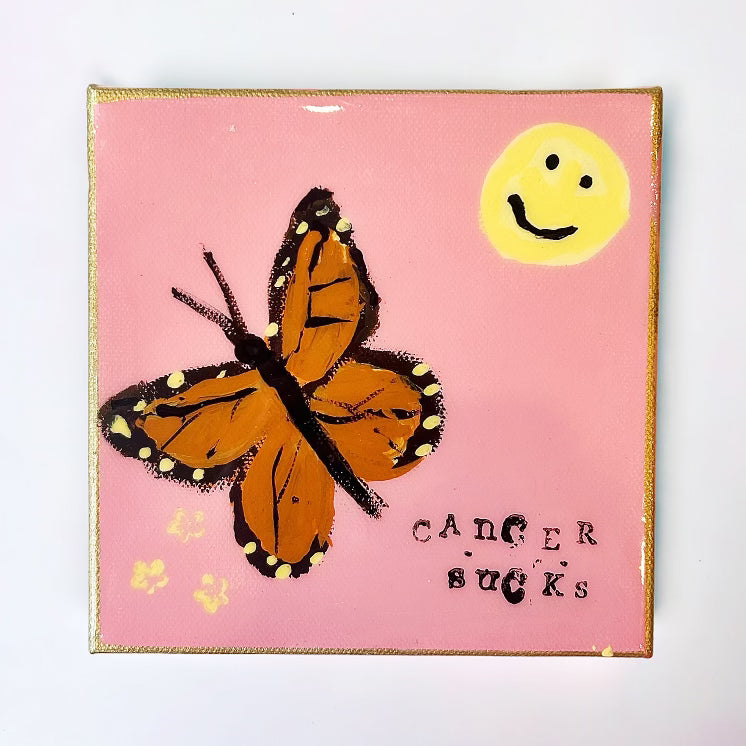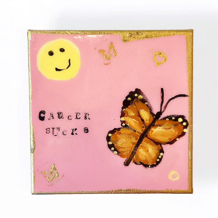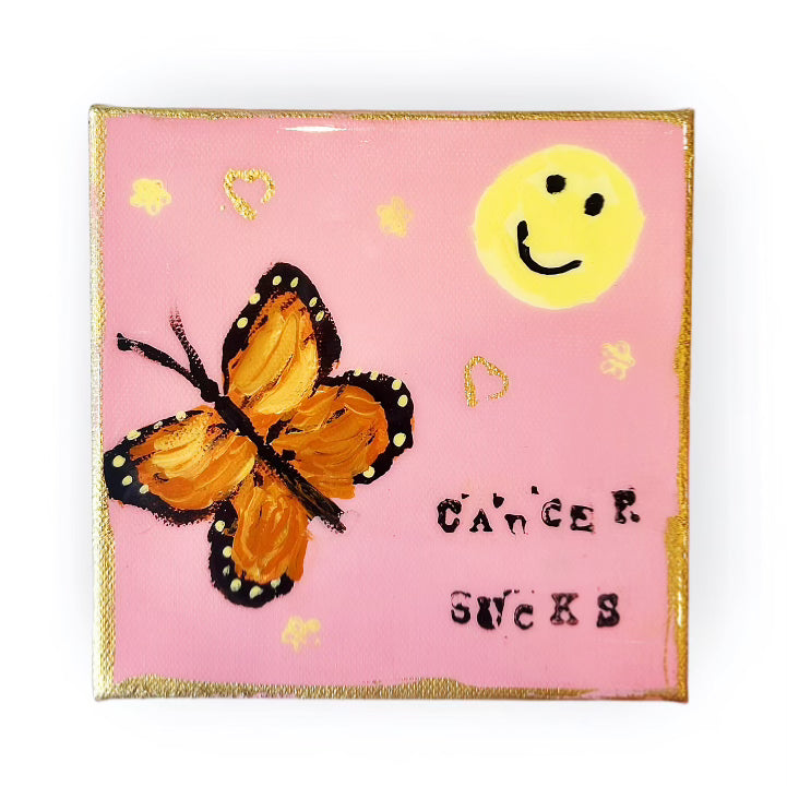 Introducing our "Cancer Sucks" Original Hale Art Painting, a powerful expression of resilience, hope, and defiance in the face of adversity. This vibrant artwork features a striking butterfly, symbolizing transformation and the beauty that can emerge from struggle. Alongside the butterfly, a cheerful smiley face radiates positivity and determination, reminding us to keep smiling through life's challenges.