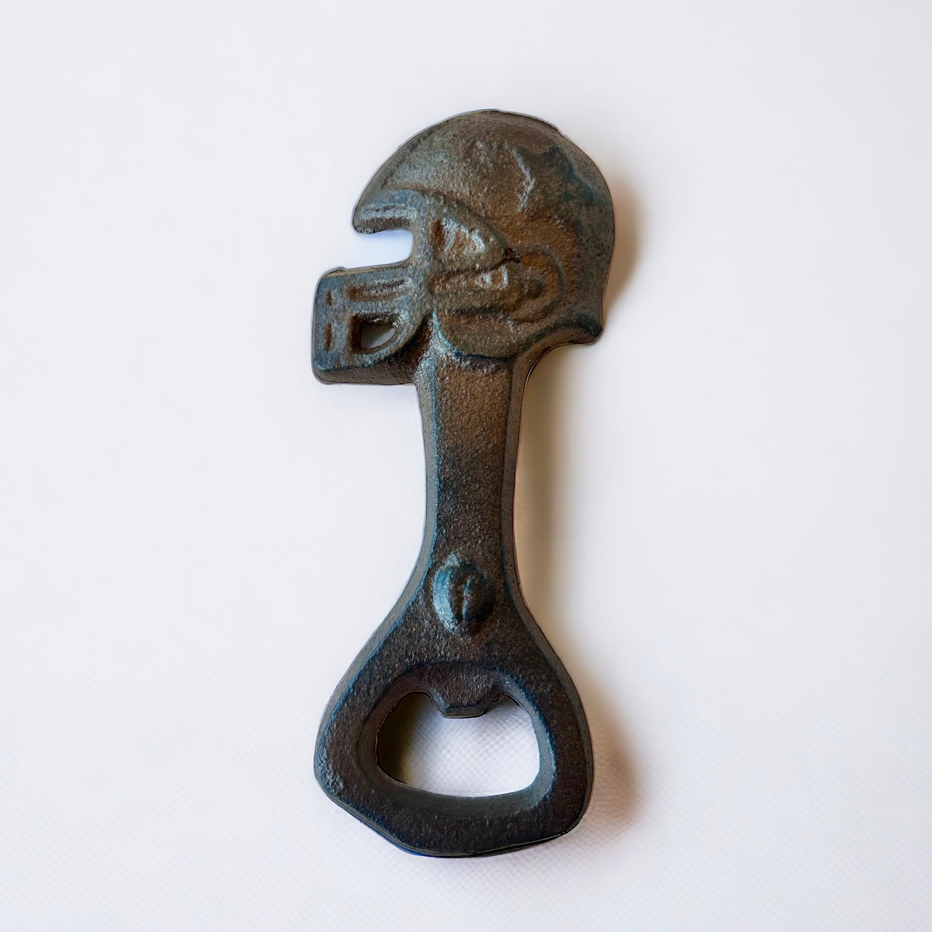 Introducing the Cast Iron Helmet Bottle Opener, a unique blend of functionality and rugged charm. Crafted from durable cast iron, this helmet-shaped bottle opener is not only a practical tool for opening your favorite beverages but also a conversation piece for your home bar or kitchen.
