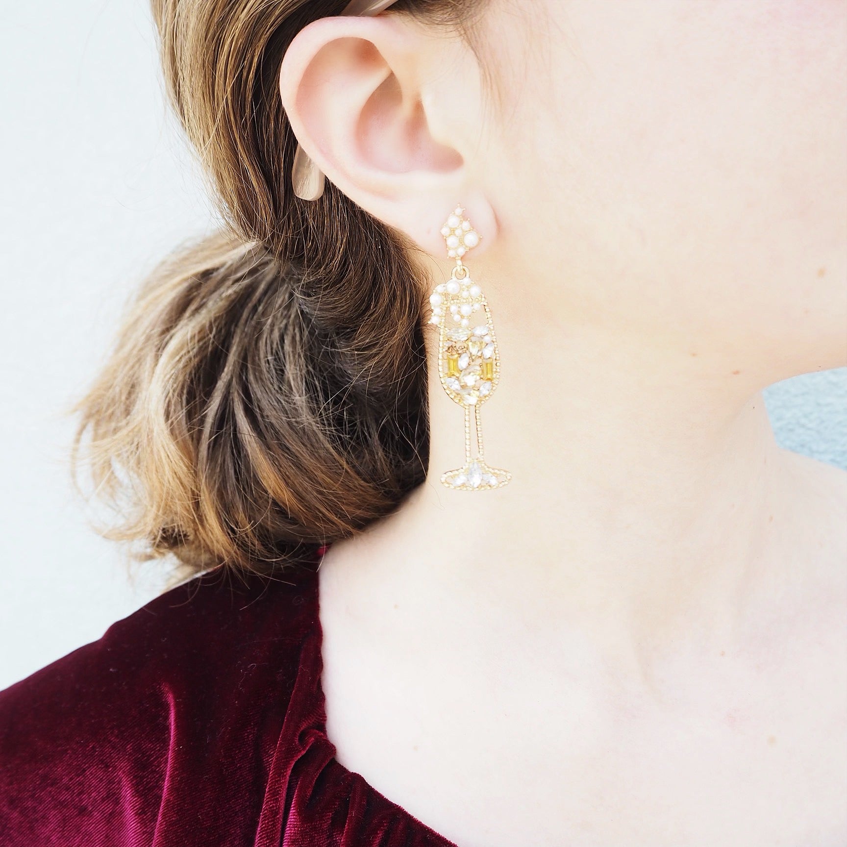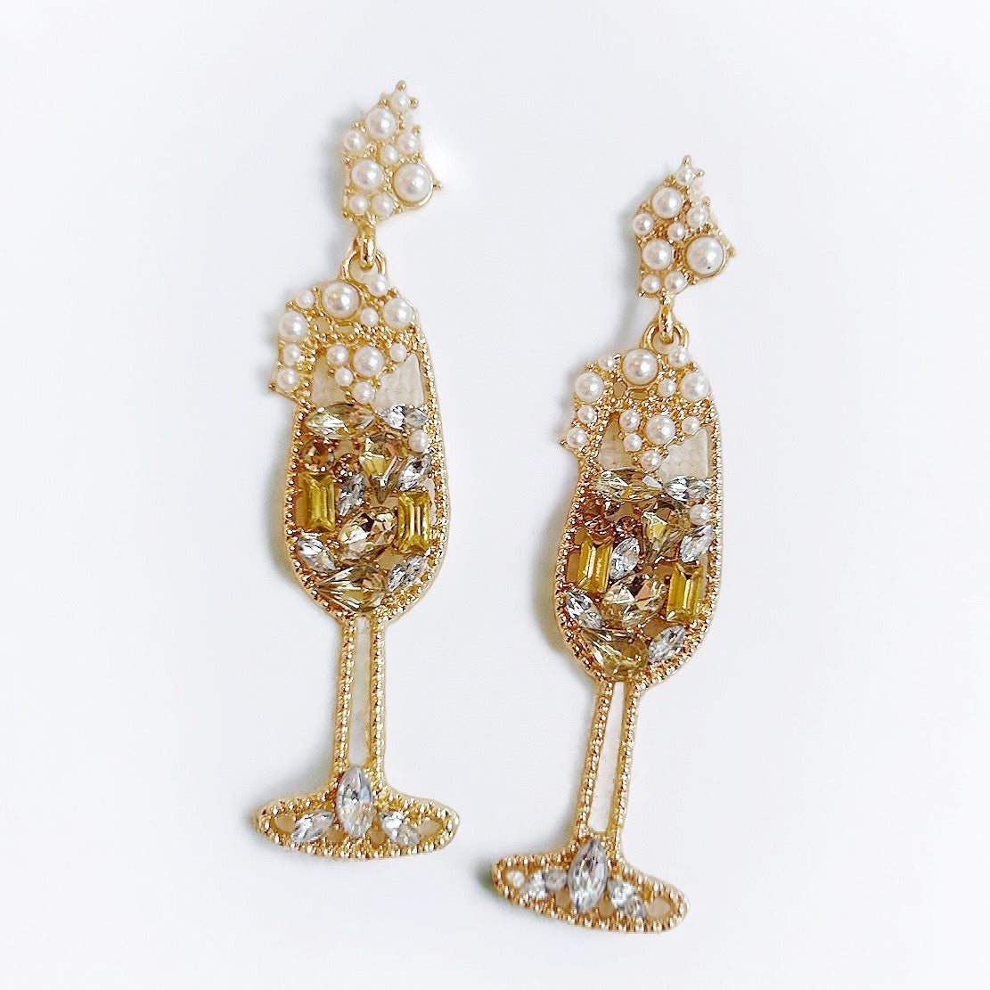 Each earring features a radiant gold champagne glass charm, meticulously adorned with lustrous pearls and rhinestones that dance in the light with every movement. The combination of gleaming gold and opulent pearls creates a captivating and indulgent aesthetic, reminiscent of the effervescence of champagne bubbles.