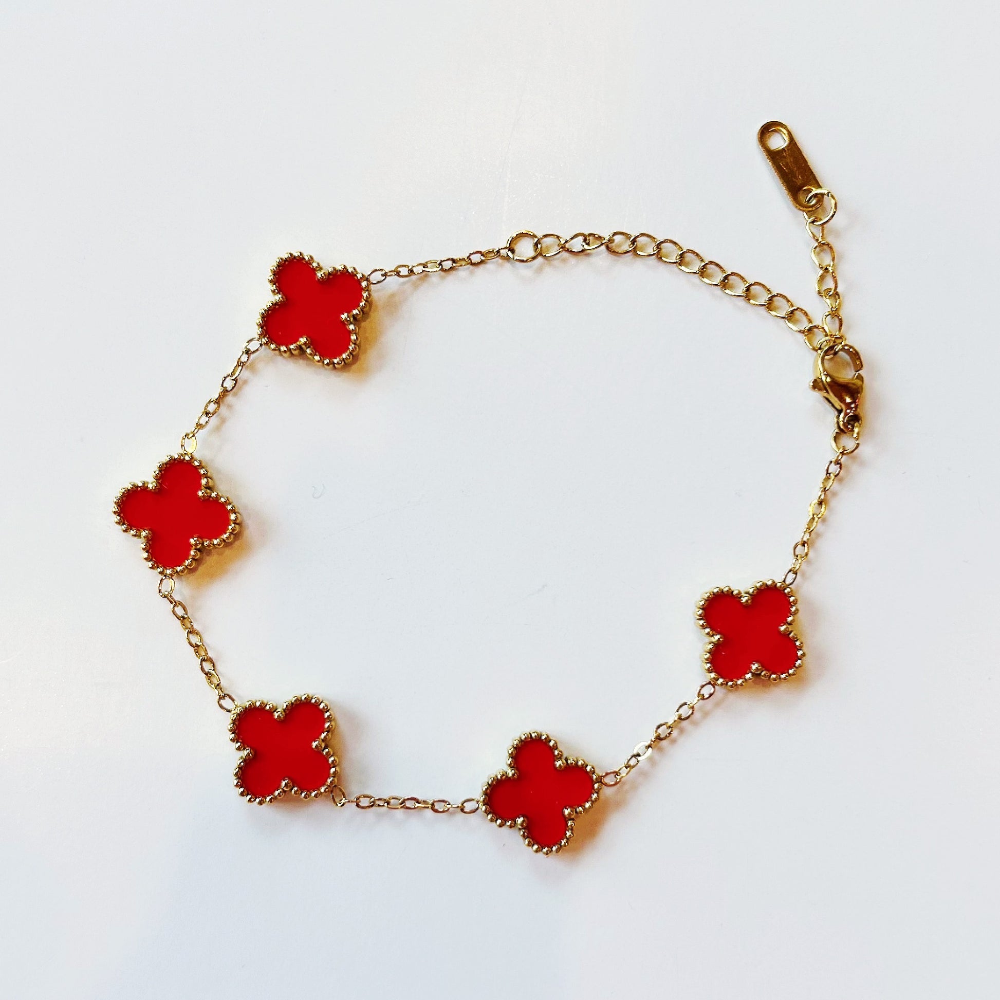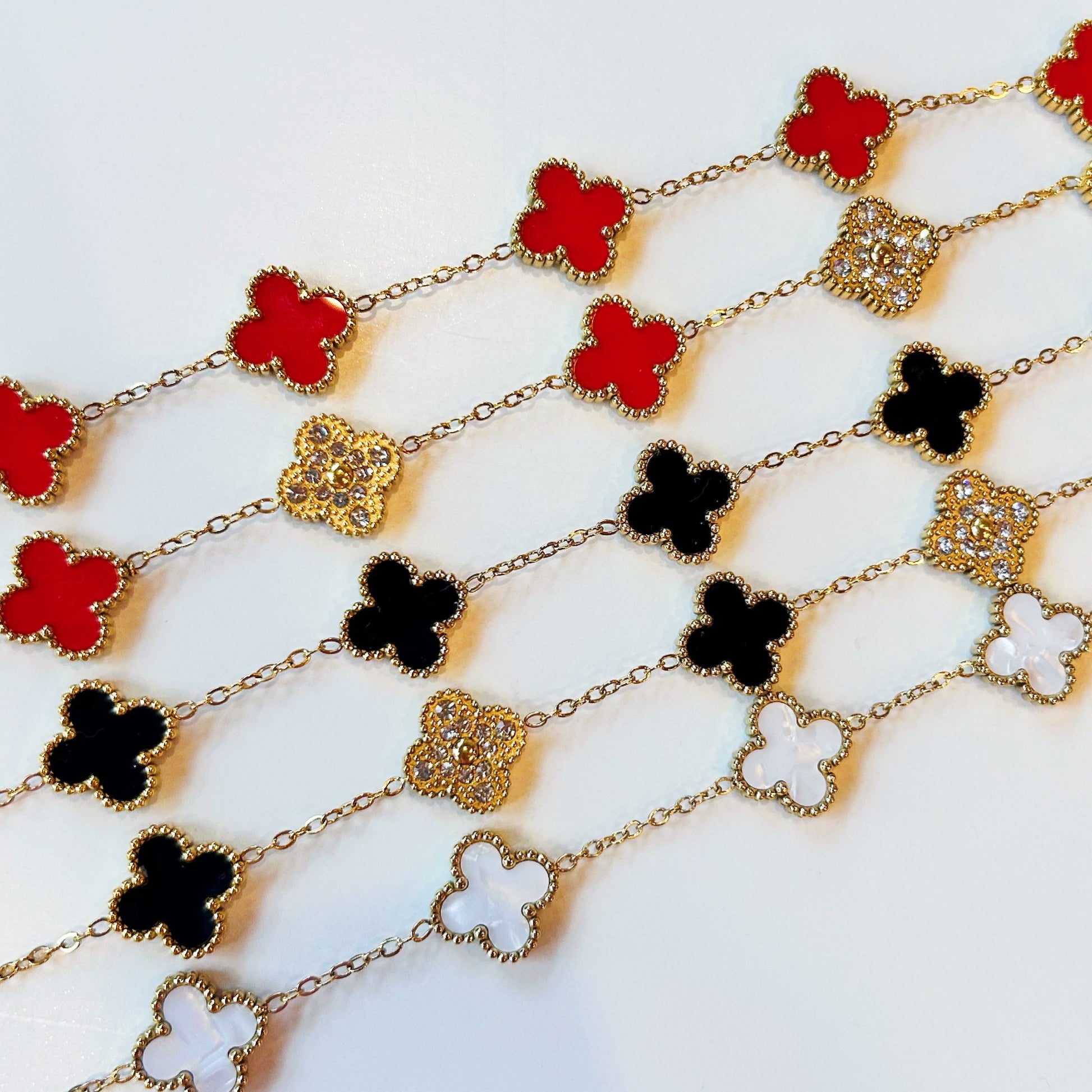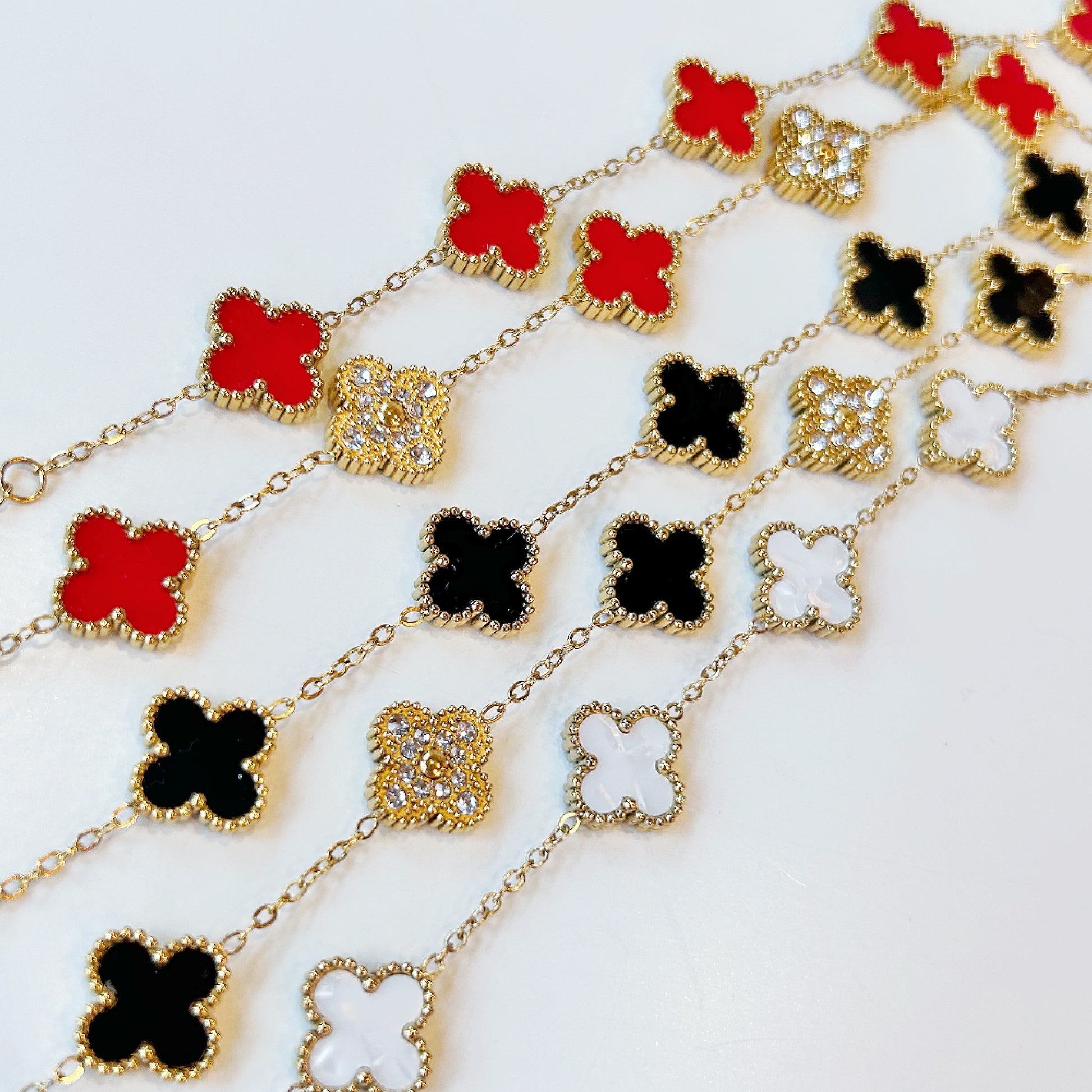 Our Gold Clover Bracelets are designed to add a touch of elegance to any outfit, whether worn alone for a subtle statement or layered with other bracelets for a bolder look. The timeless appeal of the clover symbolizes luck, making this bracelet not only a fashionable accessory but also a meaningful reminder of good fortune and positivity.