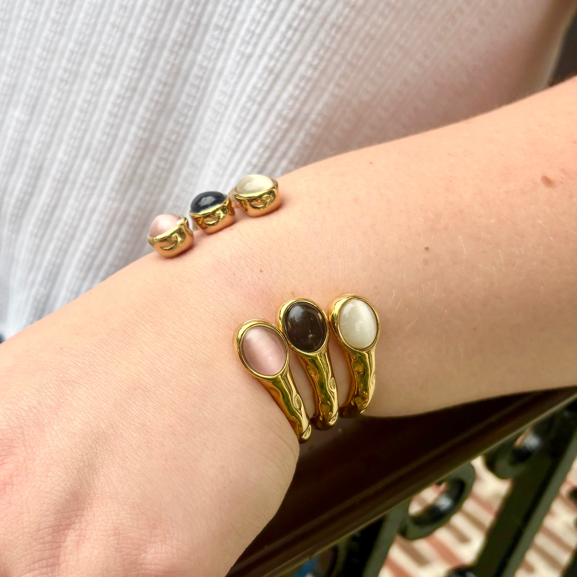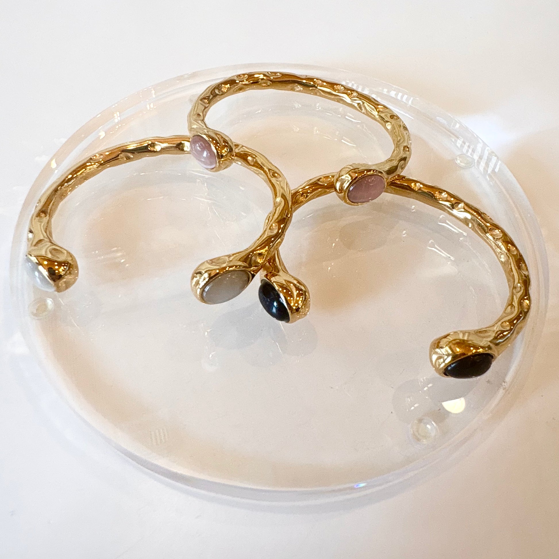 Elevate your everyday elegance with this striking gold cuff bracelet, designed with a rich, textured finish that catches the light from every angle. The band’s sculpted surface adds depth and dimension, while a single, brilliant gemstone—available in black, white, or rosy pink—adds a touch of personal expression.