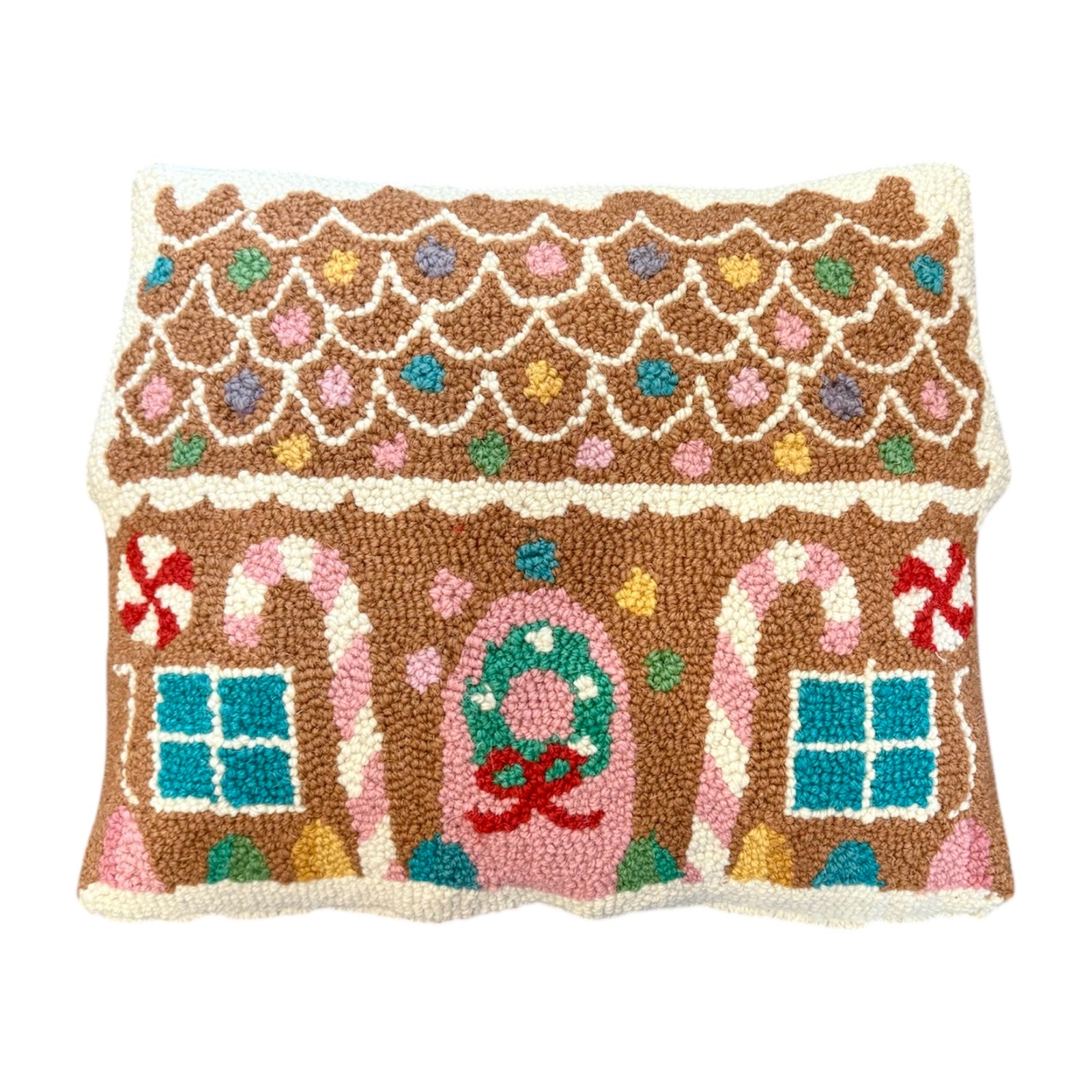 Add a whimsical touch to your holiday décor with our Gingerbread House Hooked Pillow. Crafted with love and detailed in classic holiday colors, this pillow features a delightful gingerbread house design—complete with candy canes, gumdrops, and frosting-inspired trim. The hooked wool front adds texture and a handcrafted feel, while the plush backing ensures comfort and durability.