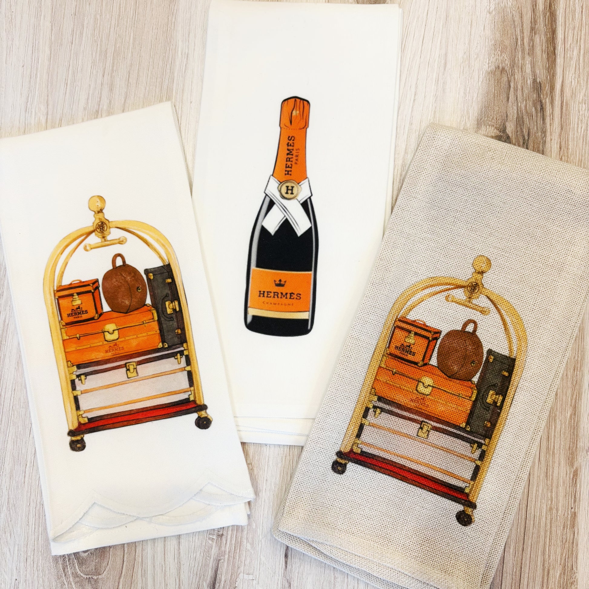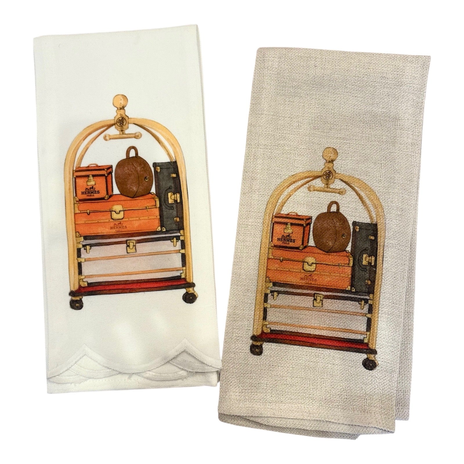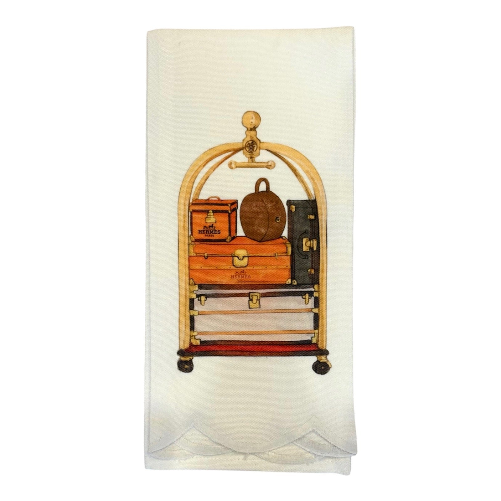 Elevate your everyday with a touch of five-star flair. The Hotel Lobby Luggage Cart Kitchen Towel features a luxe illustration of a classic gold luggage cart stacked with chic, designer-inspired bags — the kind you'd spot rolling through a glamorous hotel lobby.