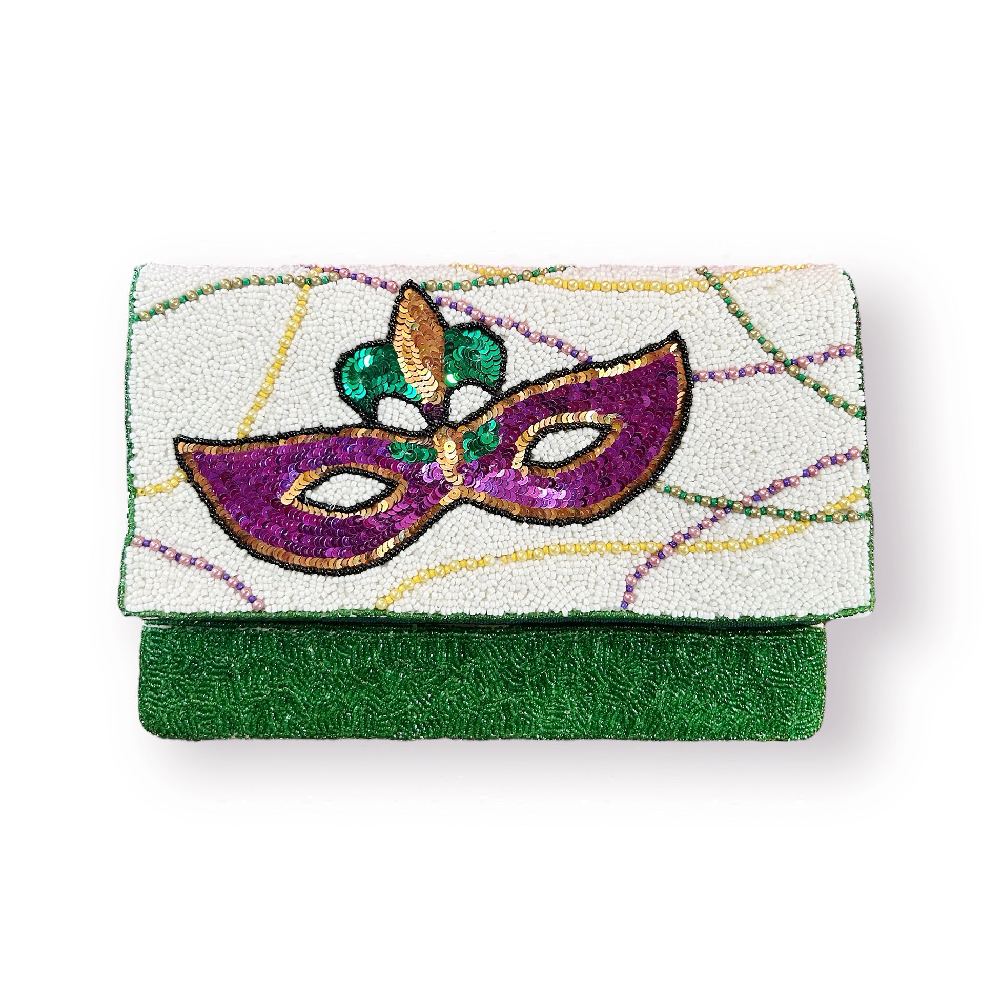 Add a touch of glamour and festivity to your Mardi Gras celebration with the Mardi Gras Mask Beaded & Sequin Purse. This eye-catching purse features an intricately designed Mardi Gras mask, beautifully adorned with shimmering beads and sequins in the vibrant colors of purple, green, and gold. The sparkling details catch the light, making it the perfect accessory for parades, parties, or any festive occasion. With a spacious interior and secure closure, this purse is both stylish and practical, offering just enough room for your essentials. Whether you're dressing up for Mardi Gras or looking for a unique accessory to complete your look, this purse is sure to make a statement. Let the beads and sequins shine as you embrace the spirit of the season!
