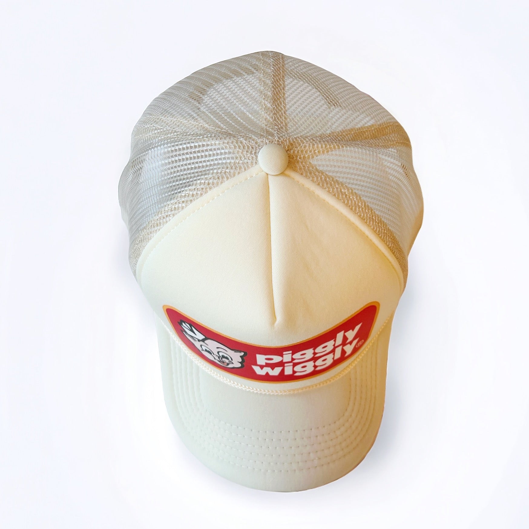 Elevate your outdoor style with our Beige Piggly Wiggle Hat, a perfect blend of fashion and function. Crafted with care and attention to detail, this hat features a timeless cream hue that complements any wardrobe. The addition of breathable netting on the back ensures maximum ventilation, keeping you cool and comfortable during your adventures.