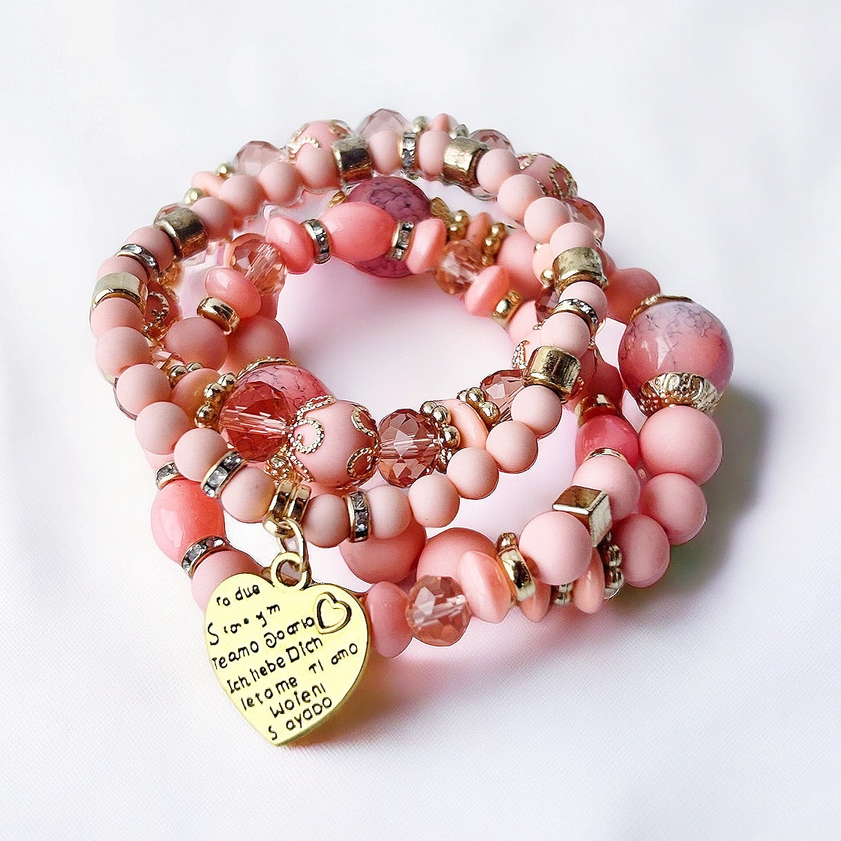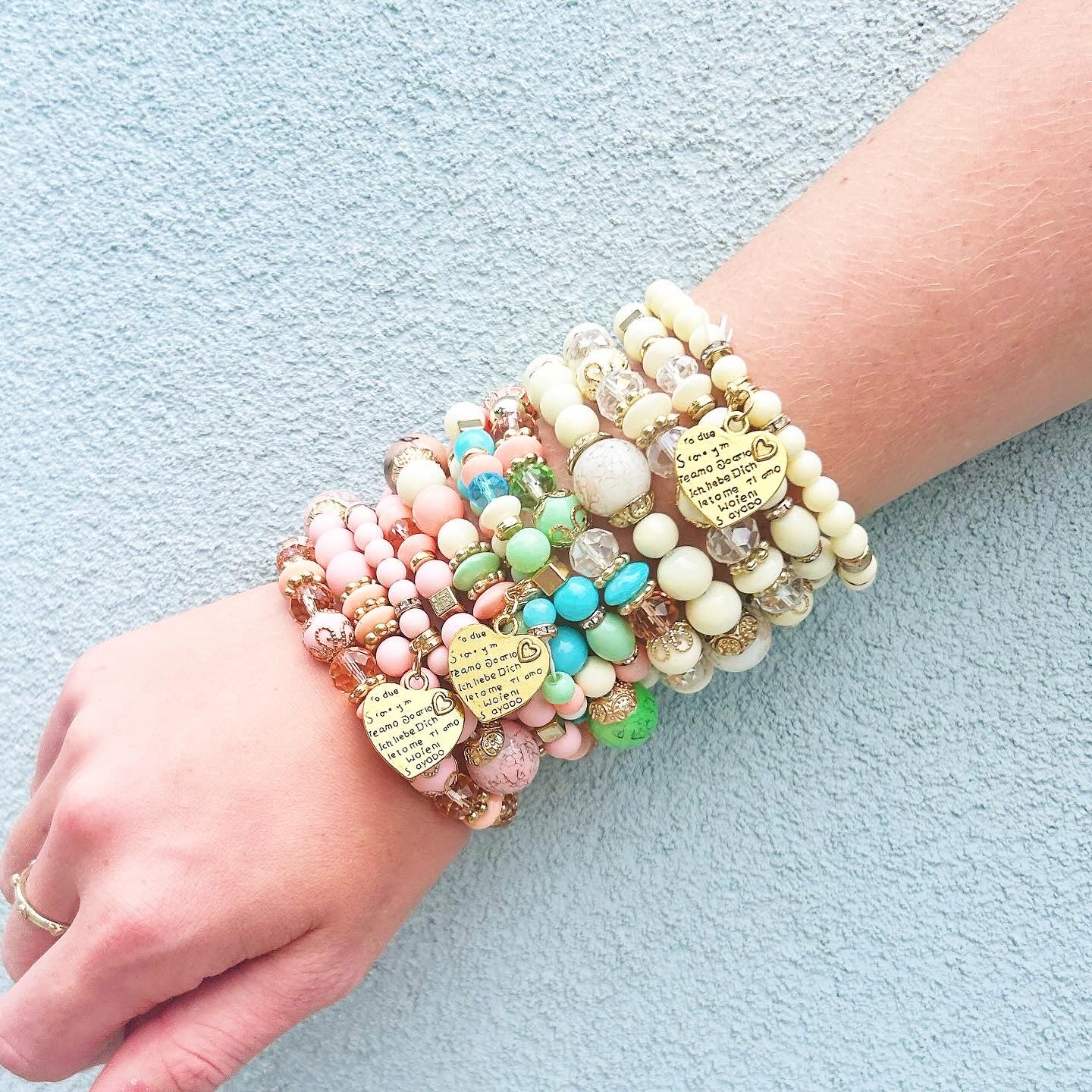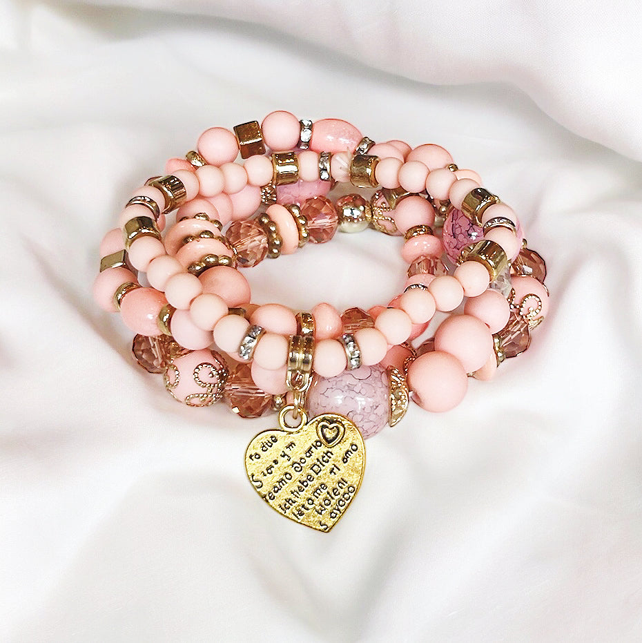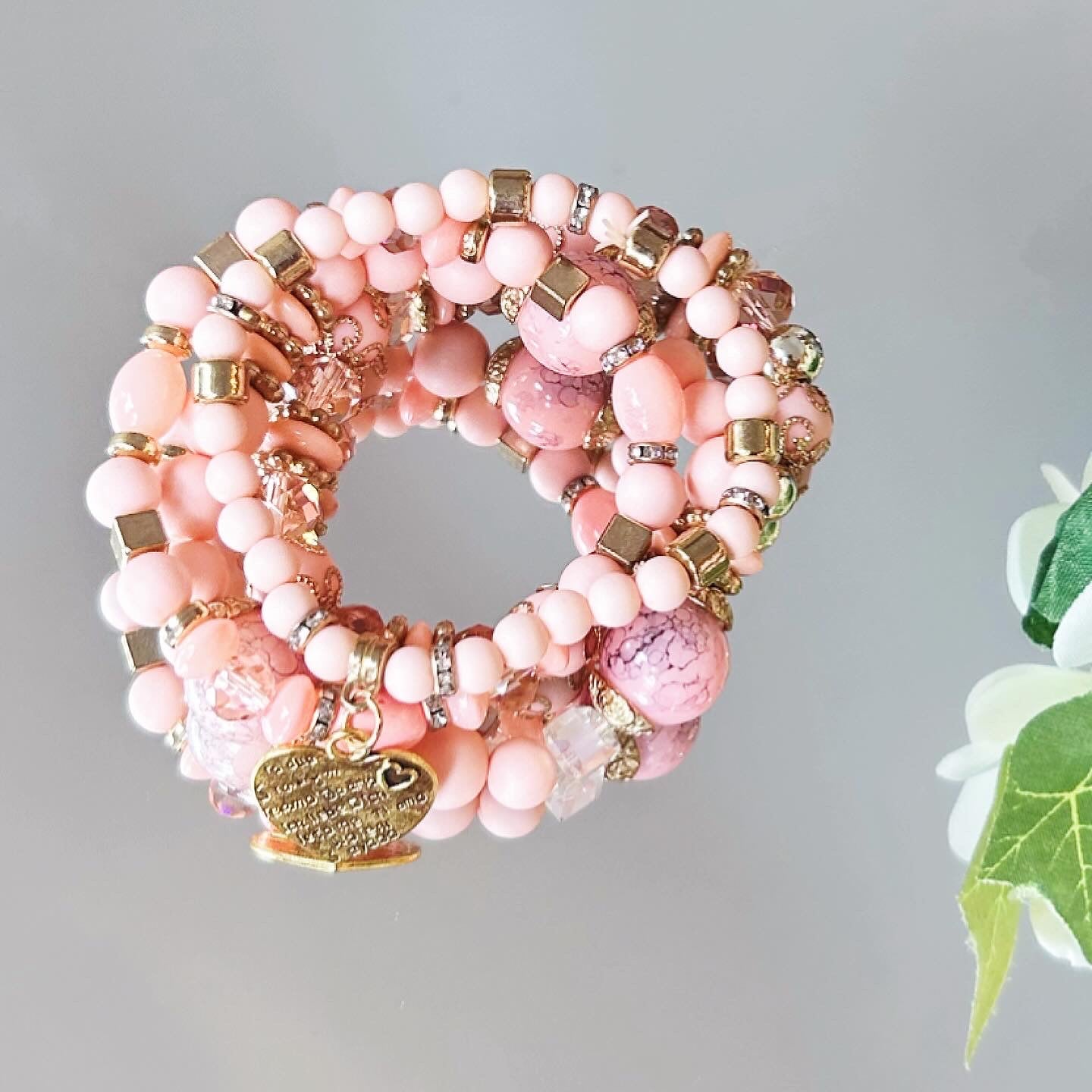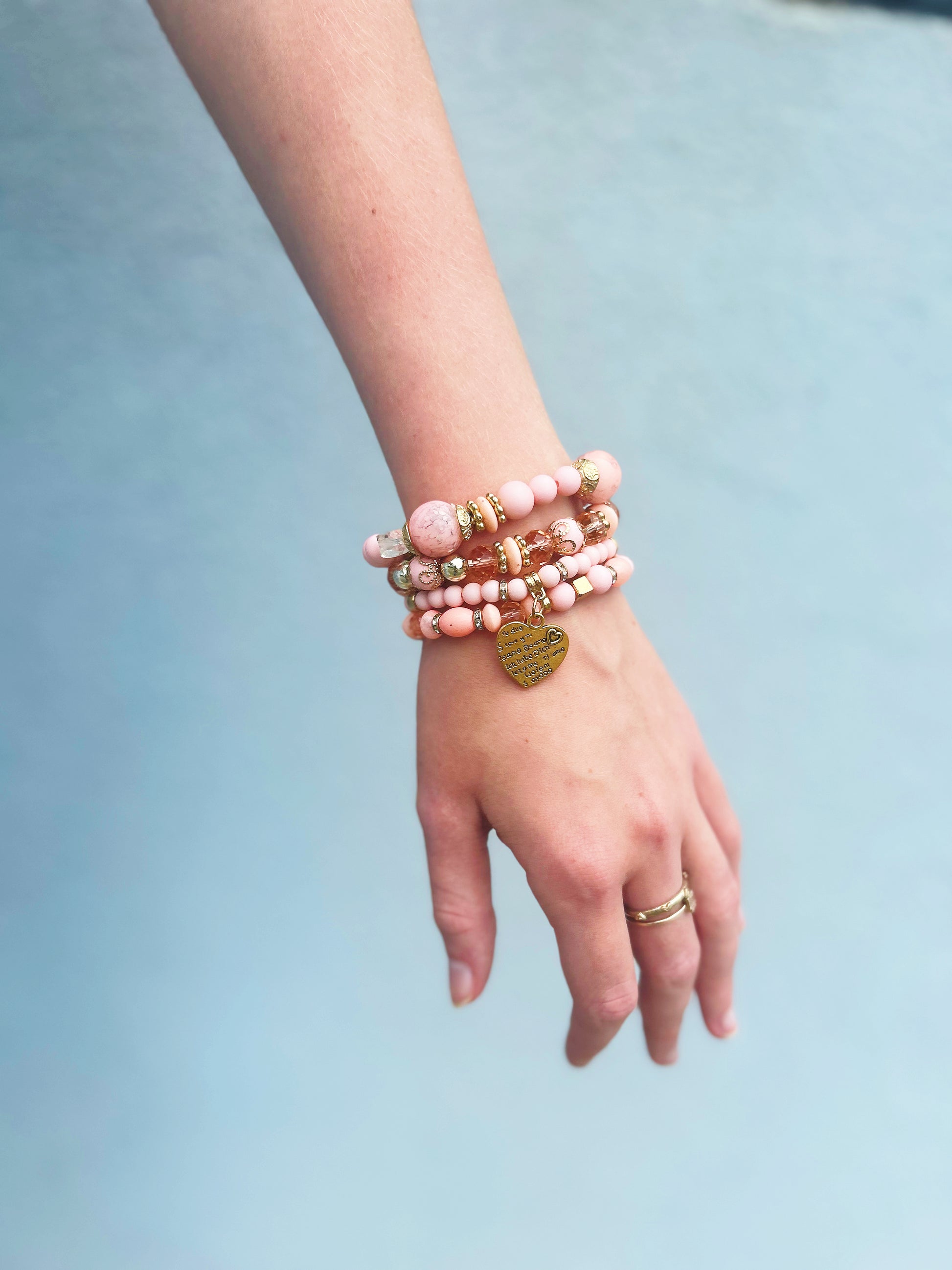 Crafted with care and attention to detail, each bracelet in this stack is hand-strung to ensure durability and quality. From soft pastel pinks to bold fuchsia tones, these bracelets are perfect for adding a feminine flair to any outfit.