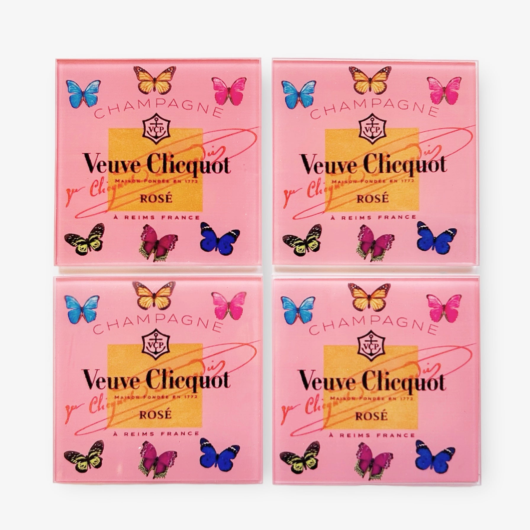 Enhance your entertaining essentials with the timeless beauty and functionality of these butterfly-adorned coasters. Order your Pink Glass Butterfly Veuve Champagne Coaster Set today and bring a flutter of elegance to your table.