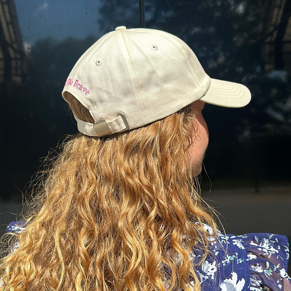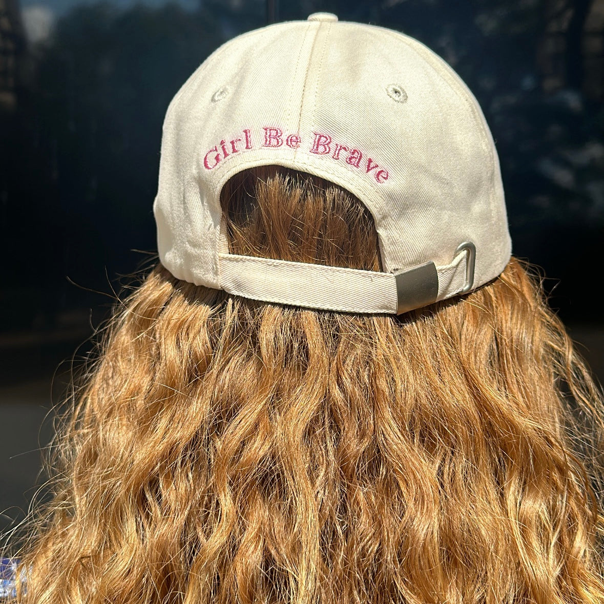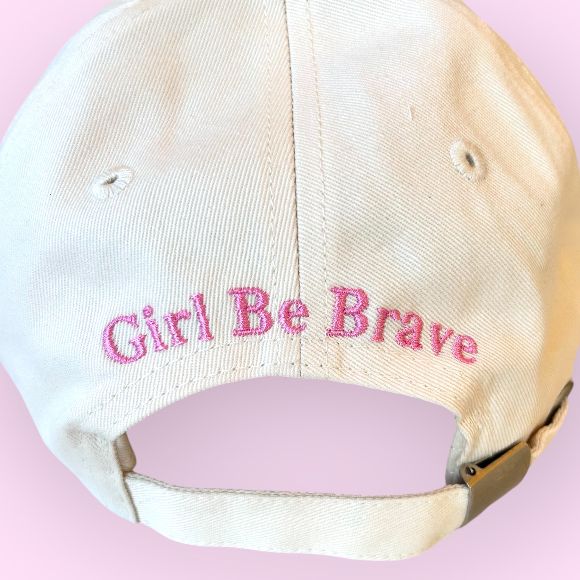 Show your support for breast cancer awareness with our Pink Ribbon Girl Be Brave Hat. Crafted in a soft, cream color, this stylish cap features a heart and breast cancer ribbon logo on the front, symbolizing strength, hope, and unity in the fight against breast cancer. The inspiring message "Girl Be Brave" is elegantly embroidered on the back, encouraging courage in every wearer.