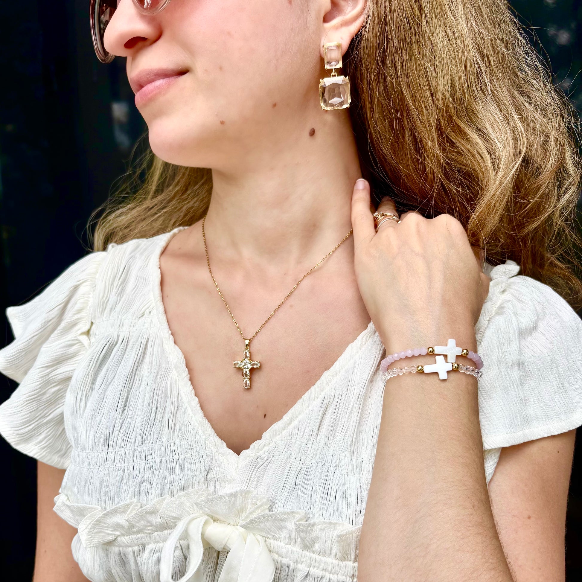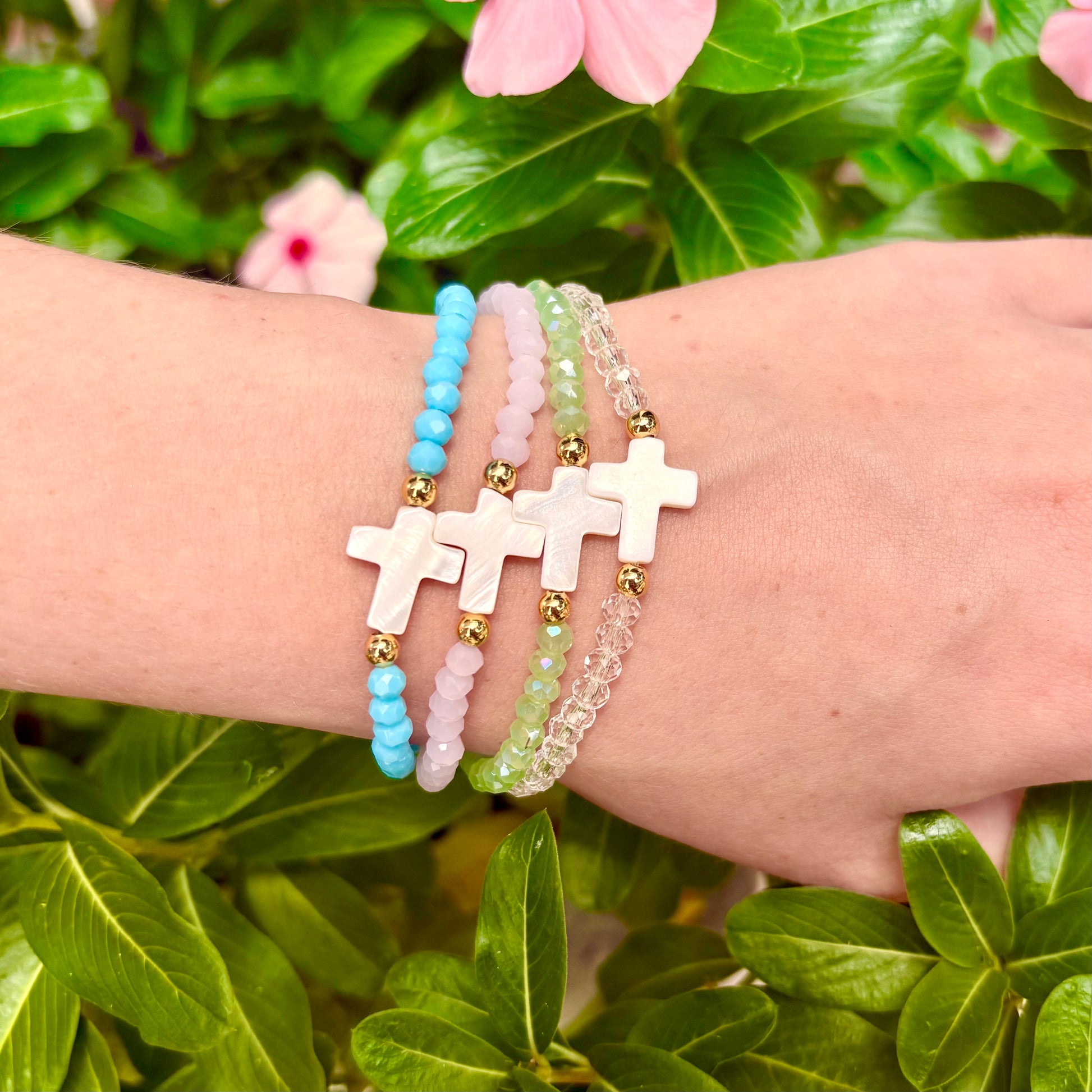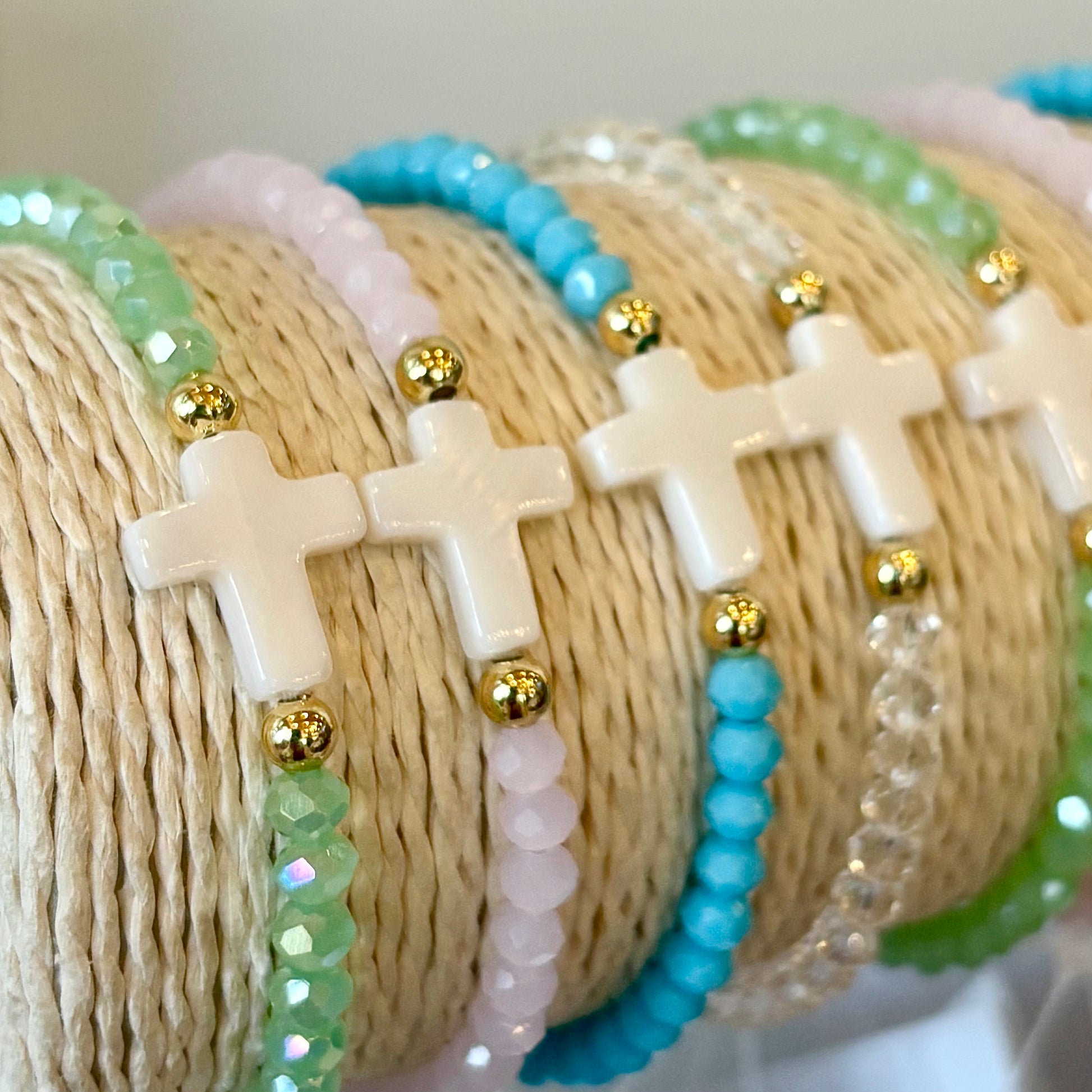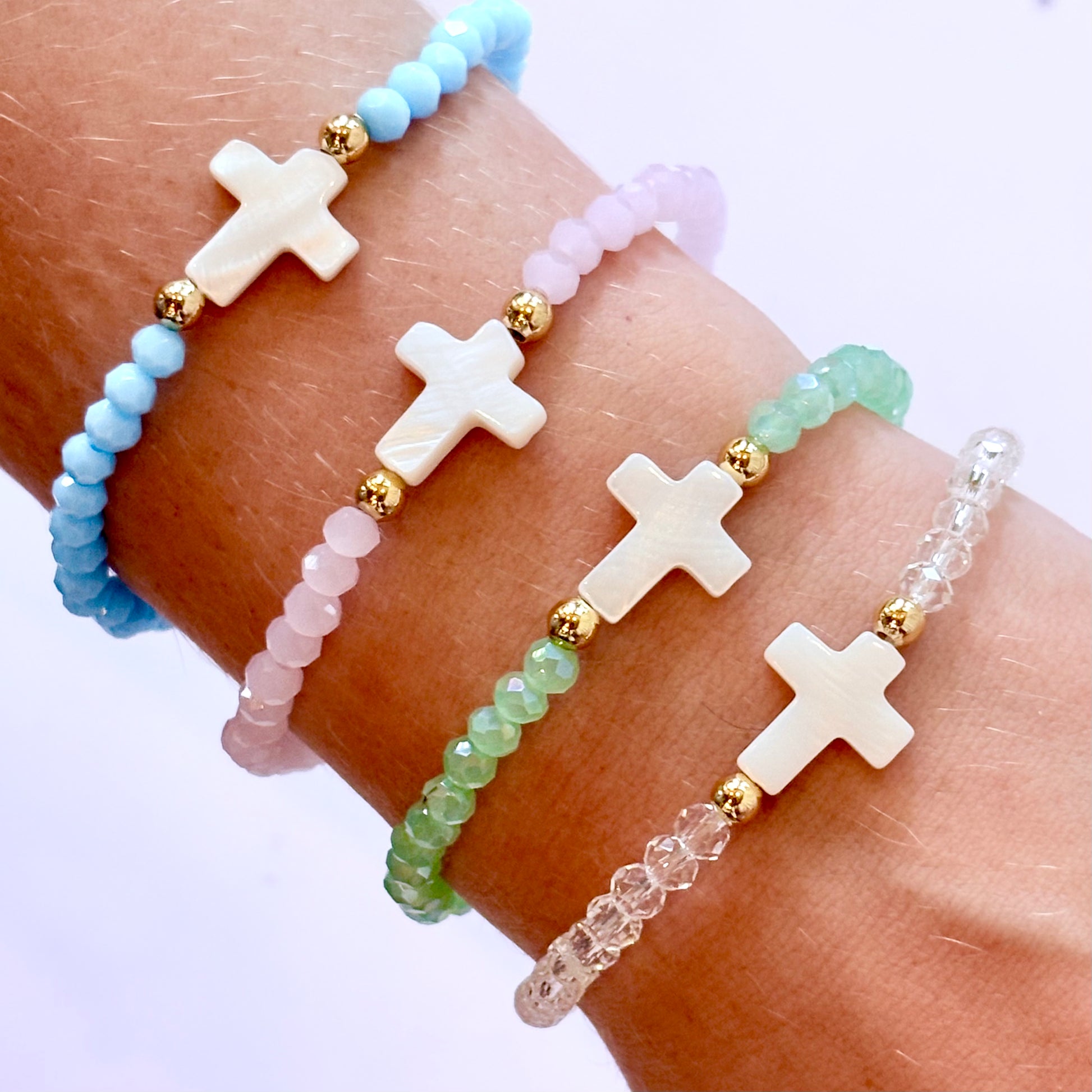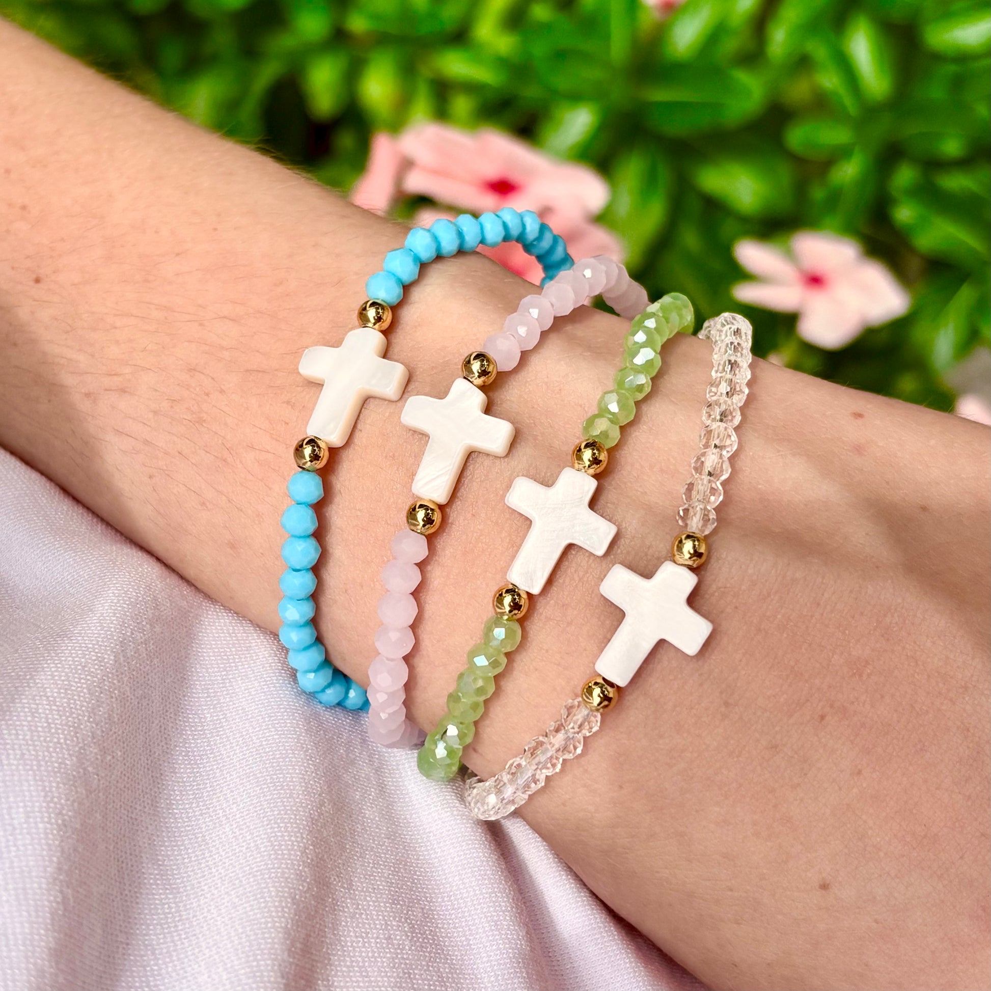 Add a touch of grace to your everyday look with our Crystal Faith Bracelet — a delicate blend of color, sparkle, and meaning. Each bracelet features a single strand of radiant crystal beads in your choice of blue, clear, pink, or green, paired with an elegant ivory cross charm for a simple yet powerful symbol of faith.