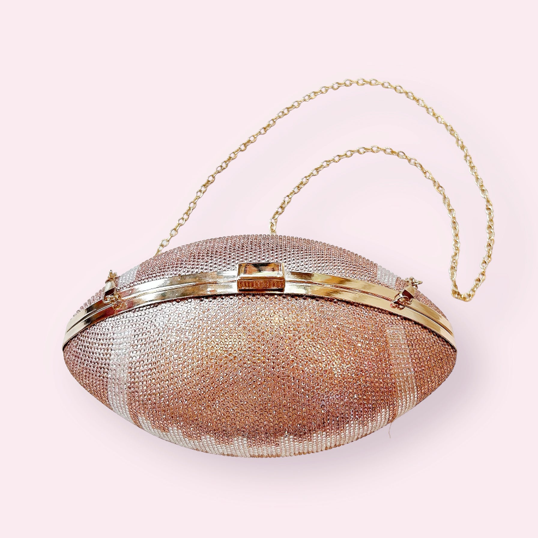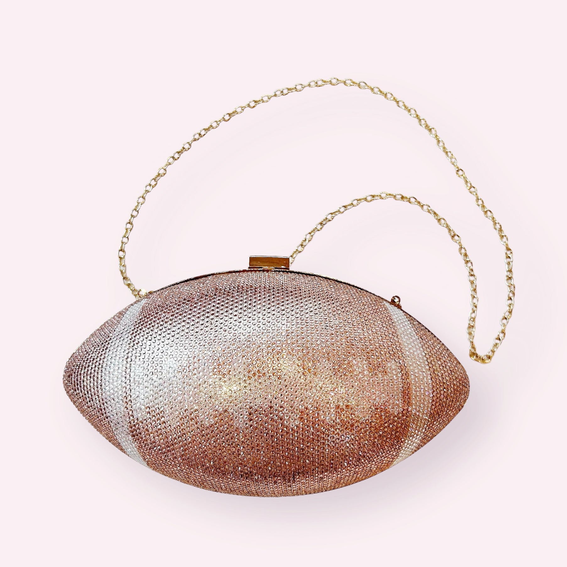 Elevate your style with our Rhinestone Football Clutch Purse, designed to captivate attention and showcase your love for the game. Shaped like a classic football, this clutch is adorned with sparkling rhinestones that shimmer and shine from every angle, adding a touch of glamour to any outfit.