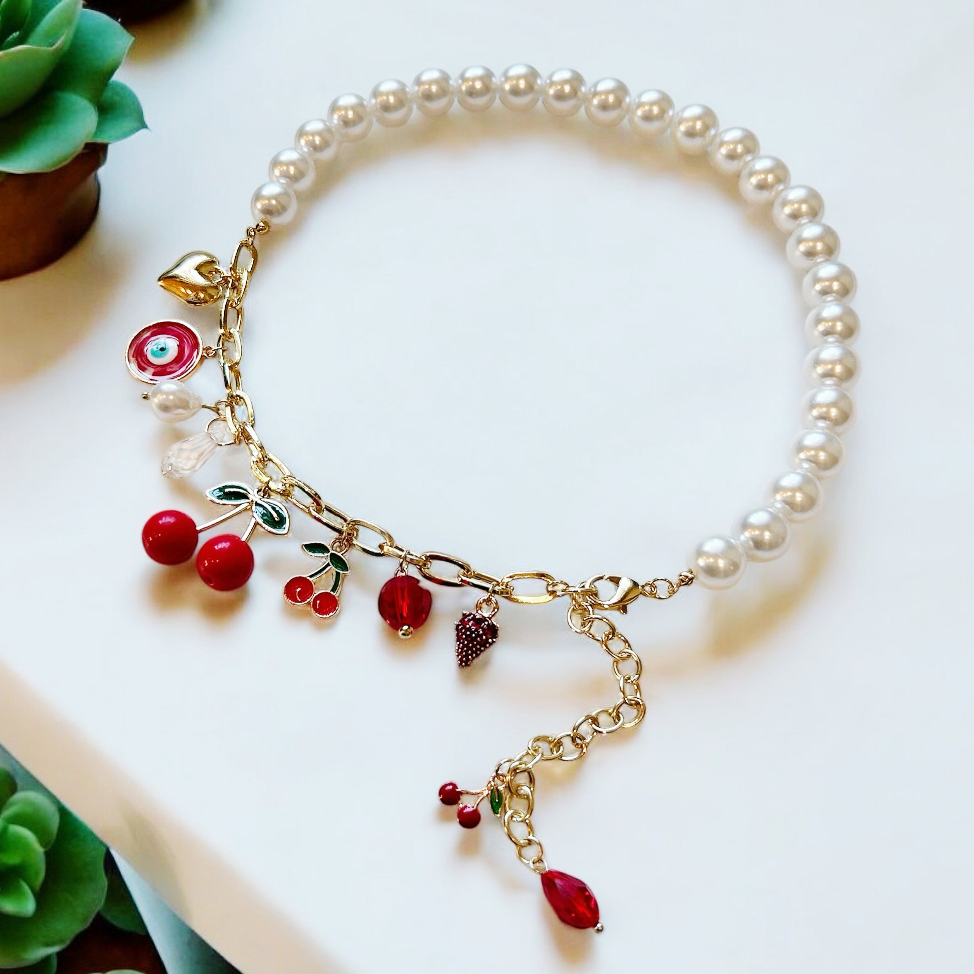 Indulge in the perfect blend of elegance and playful charm with the Ruby Red Charm Necklace. This striking design features two distinct halves that come together in a harmonious, eye-catching piece. One side is a delicate string of lustrous pearls, adding a touch of classic sophistication, while the other side boasts a shimmering gold chain adorned with an array of vibrant red-themed charms—think sweet cherries, ripe strawberries, sparkling gems, and heart-shaped accents.