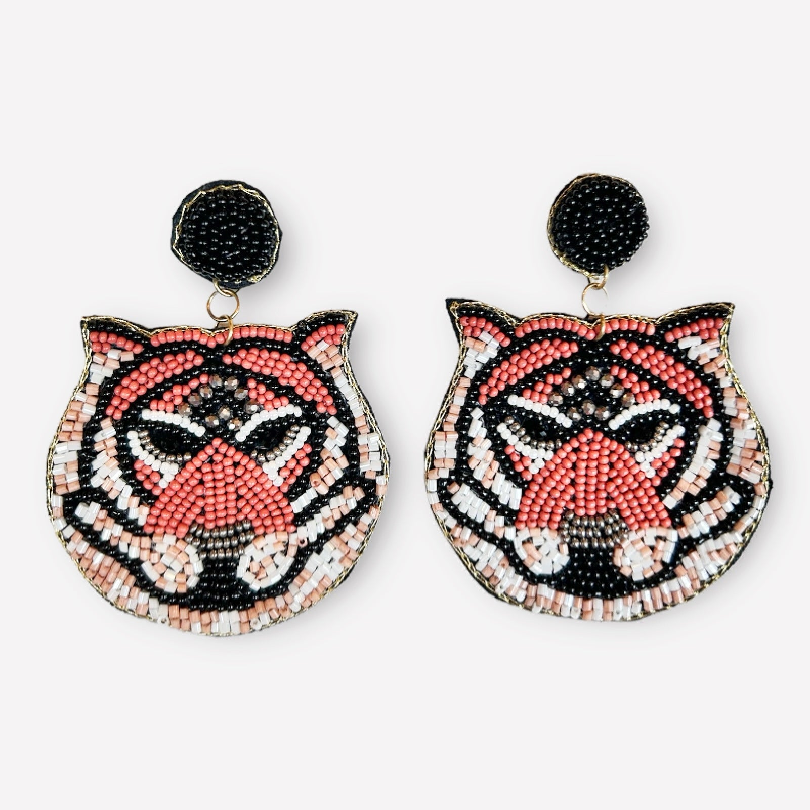 Unleash your wild side and show off your team spirit with our Tiger Beaded Earrings. These stunning earrings feature a meticulously crafted tiger design made from high-quality beads, capturing the fierce and majestic essence of this powerful animal. Perfect for fans of teams with tiger mascots or anyone who loves bold and unique accessories.