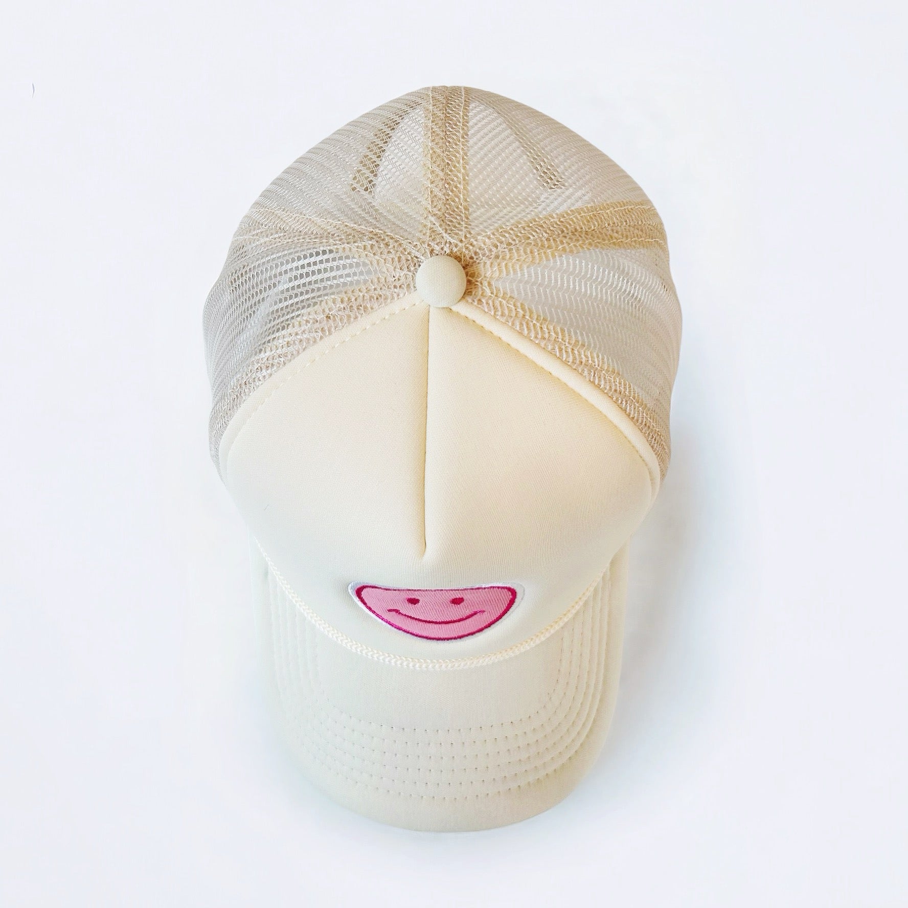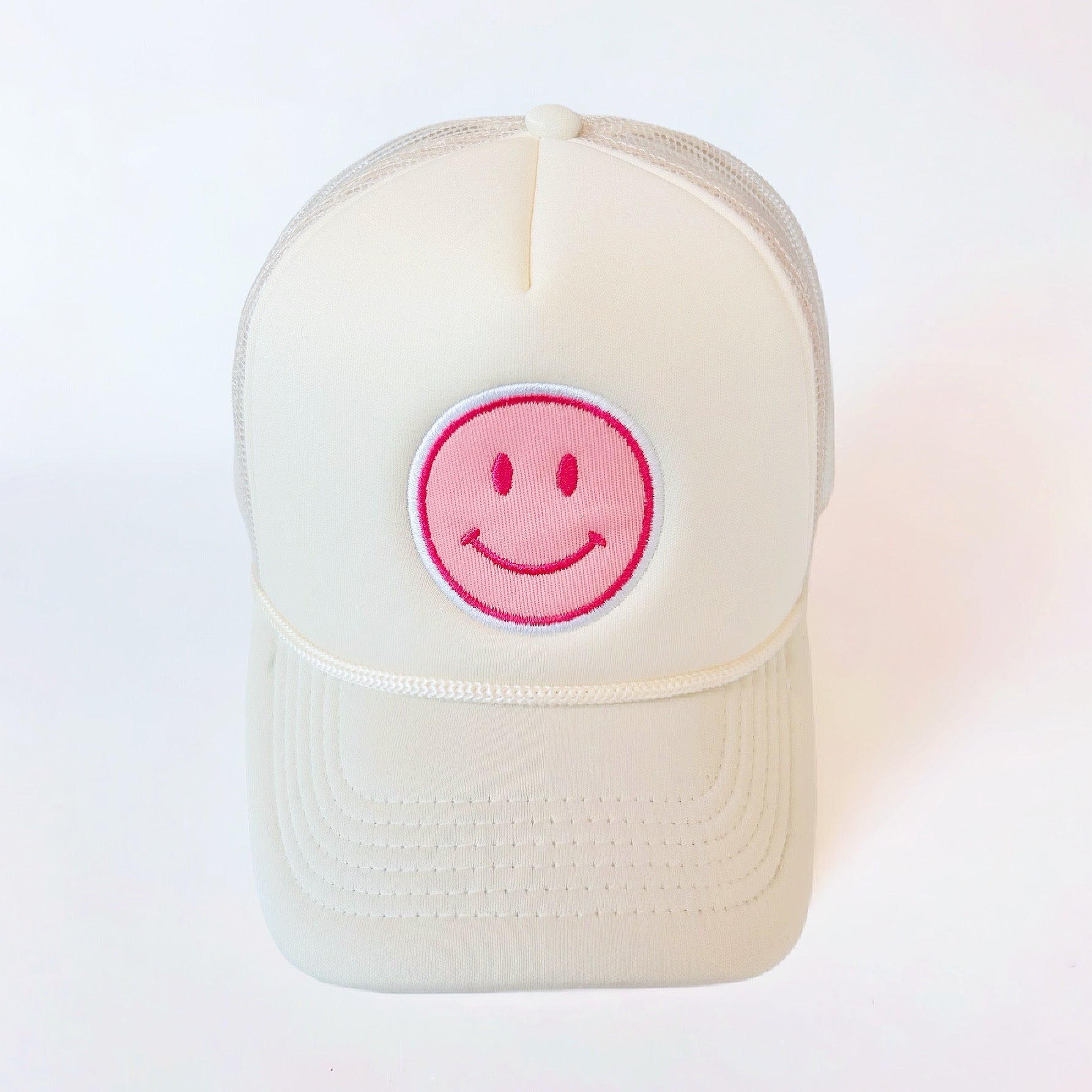Introducing our Tan & Pink Smiley Face Hat, a delightful accessory to brighten up any outfit and spread positivity wherever you go. This charming hat features a soft tan color with a playful pink smiley face embroidered on the front, adding a touch of whimsy and cheer to your look.
